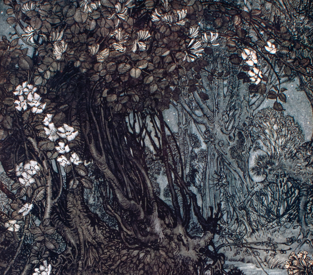 Through the twisted branches you can just make out an overgrown structure covered in vines. Moonflowers almost glow on the roof as they catch the light.