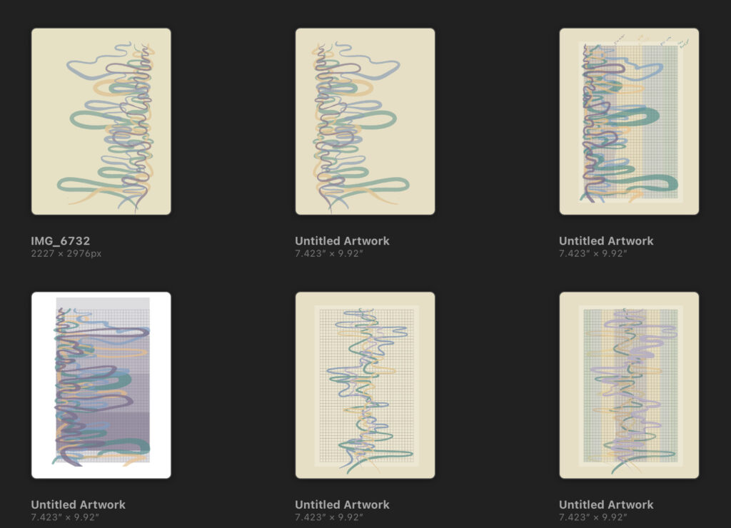 I’m playing around with the form of a meandering river bed, and used the data to create four different paths for visual art, self publishing, blogging, and zines. Here are some mock ups in Procreate.